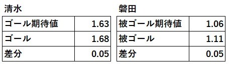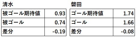 また清水の被ゴール期待値と磐田のゴール期待値は下表の通りである。