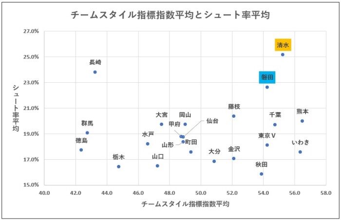 これによると清水も磐田もチームスタイル指標指数平均の差は小さいが、シュート率平均は清水の方が明らかに高い。清水の方が、攻撃からシュートに至る確率が高い。積極性という言葉だけで片付けてはいけないとは思うが、清水の積極性を表していると思われる。