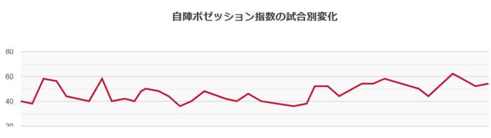 どの辺りでボールを保持しているかというと、自陣である。終盤は自陣ポゼッション指数が上昇している。自陣でボールを持たされているのではないかと推測できる。