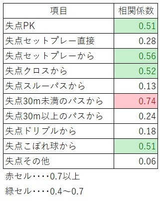 相関係数は失点(30m未満のパスから)がずば抜けて高いです。