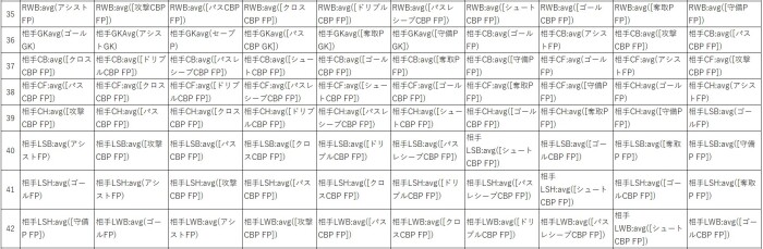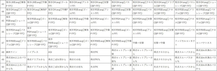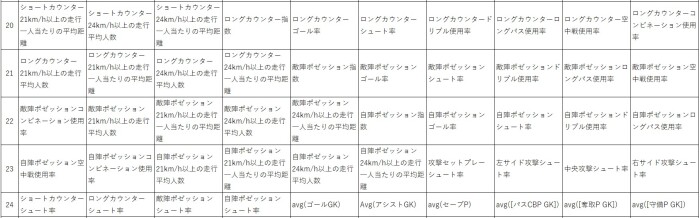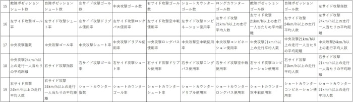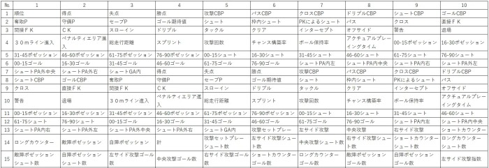 同じ名称の項目もありますが、自チーム側から見た数値と相手チーム側から見た数値がありますので別項目ということになります。