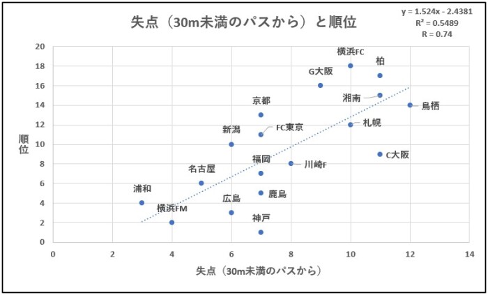 今回取り上げるのは失点(30m未満のパスから)と順位です。