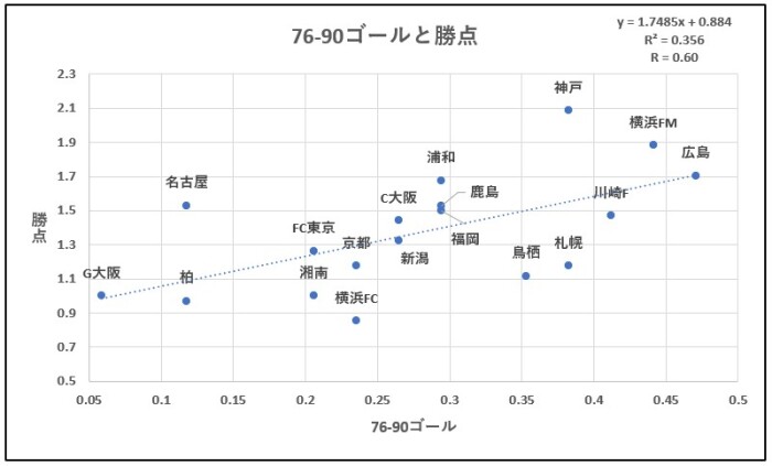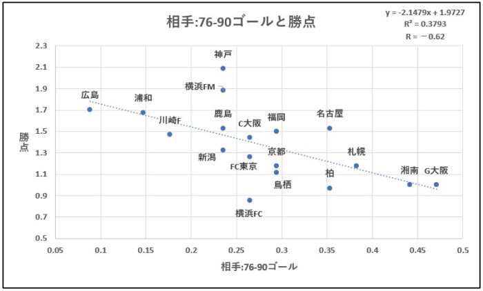 76分から90分の時間帯でゴールが多いチームほど勝点が多くなるという関係です。