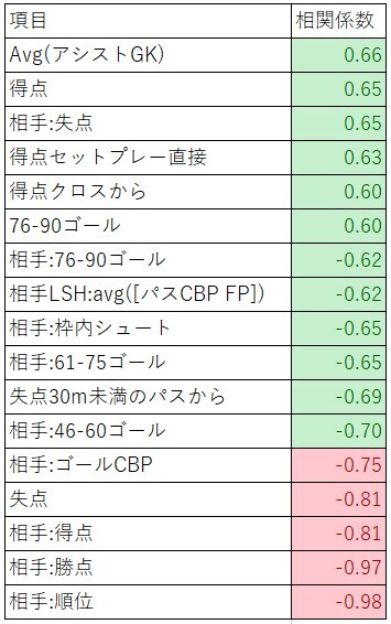 勝点と|0.6|以上の相関関係にある項目を下表に抜粋しました。