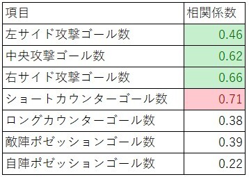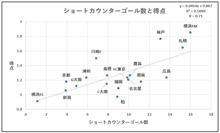 興味深いのはショートカウンター関係です。ショートカウンターゴール率が相関係数0.73,ショートカウンターゴール数が0.71になりました。