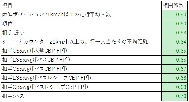 ポジションごとの相関係数も載っています。CB(センターバック)やLSB(レフトサイドバック)のパスCBPやパスレシーブCBPが小さくなると自チームの得点が増えるという関係です。
