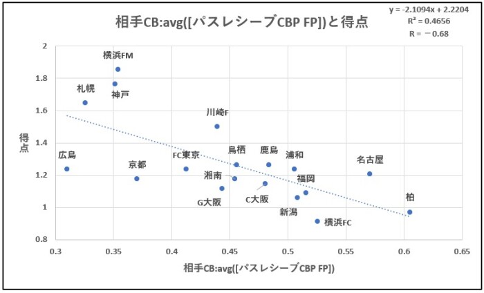 ちなみに相手CB:avg([パスCBP FP])とペナルティエリア進入との相関係数は-0.62であり、また相手CB:avg([パスレシーブCBP FP])とペナルティエリア進入との相関係数も-0.62です。このことから、バックラインでのビルドアップ力がないとボールを奪われてショートカウンターからペナルティエリア進入という絵が想像できます。