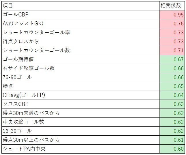 ということで、チームスタイルごとのゴール数と得点の相関係数も掲載しておきます。
