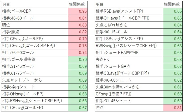 ポジション別で見ると、相手RSB:avg(アシストFP)相関係数0.66、相手LSB:avg(アシストFP)相関係数0.63という項目が目立ちます。両サイドから失点しているように見えます。SBを置かないチームもあることから、相関係数が少し高くなっているようです。