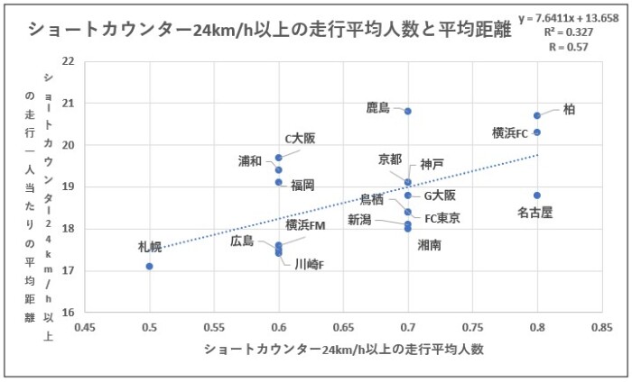 しかし最も興味深いのはショートカウンター24km/h以上の走行一人当たりの平均距離です。相関係数は-0.78であり、強い負(マイナス)の相関関係です。