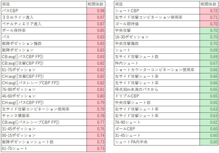 ゴール保持率は30mライン進入回数、ペナルティエリア進入回数、チャンス構築率、そして得点と正の相関関係にあります(相関係数は割愛)。ボールを保持することで、30mライン進入回数が増え、ペナルティエリア進入回数が増え、チャンス構築率が上がり、攻撃CBPが増え、最終的に得点が増えるのだと思います。