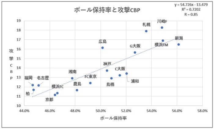 ボール保持率が高いチームほど攻撃CBPが大きいです。