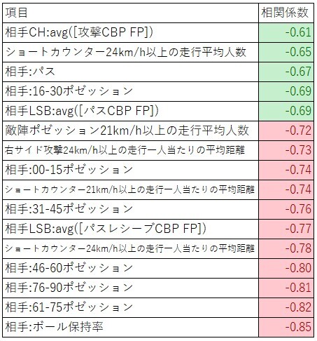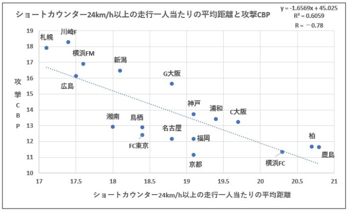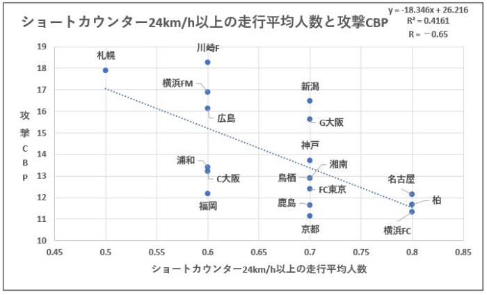ショートカウンター24km/h以上の走行一人当たりの平均距離が長いと攻撃CBPが小さくなり、ショートカウンター24km/h以上の走行一人当たりの平均距離が短いと攻撃CBPが大きくなります。
