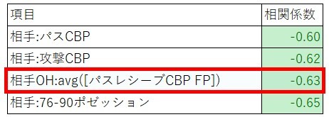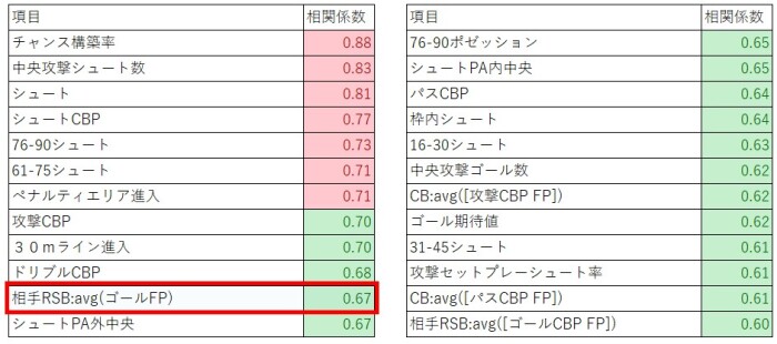 この中で注目したのは「相手RSB:avg(ゴールFP)」です。相関係数は0.67です。