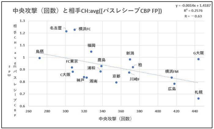 前回は攻撃セットプレー(回数)を軸に見て行きましたので、今回は中央攻撃(回数)を軸に見て行きます。