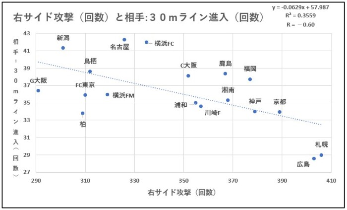 右サイド攻撃(回数)が少ないと相手:30mライン進入(回数)が多くなります。