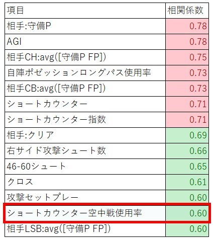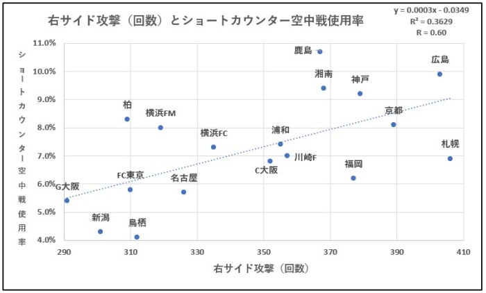 右サイド攻撃(回数)が増えるとショートカウンター空中戦使用率が上昇するという関係です。