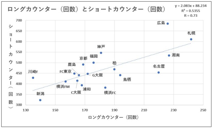 この関係から、ロングカウンター(回数)が多いチームはショートカウンター(回数)も多いということになります。