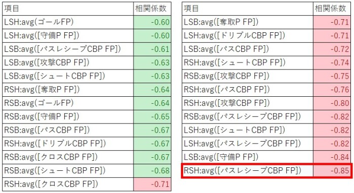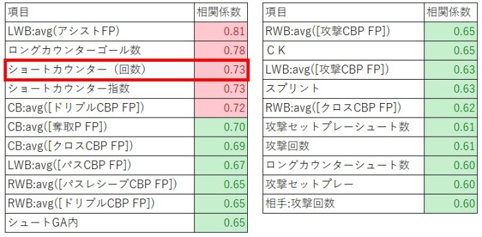 最初に出した正(プラス)の相関の表では、WB(ウイングバック)はプラスの相関関係になっていることが分かります。