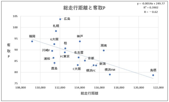 総走行距離と奪取Pです。負の関係です。この図から、守備に追われているから総走行距離が延びるのではないかと推測できます。奪取Pが高くボールを奪いきることが出来れば、総走行距離が短くなるのではないかと思います。