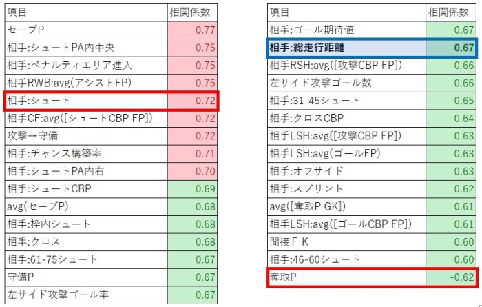総走行距離と相手:シュートです。「総走行距離が長くなると相手:シュートが増える」のではなく、相手の攻撃が多くなると(長くなると)、攻撃に対して守備機会が多くなり(守備時間が長くなり)総走行距離が長くなるのではないかと考えられます。上の表の通り総走行距離は相手チームの攻撃に関する項目と関係が強いようです。ということから総走行距離は守備に大きく影響している可能性が高いです。