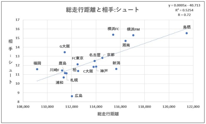 >「総走行距離が長くなると相手:シュートが増える」のではなく、相手の攻撃が多くなると(長くなると)、攻撃に対して守備機会が多くなり(守備時間が長くなり)総走行距離が長くなるのではないかと考えられます。