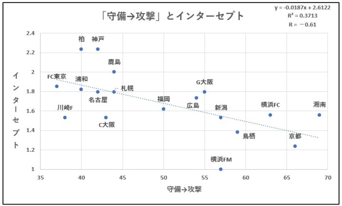 次は「守備→攻撃」とインターセプトの関係を散布図にしました。