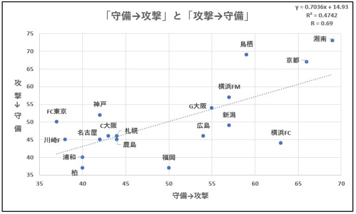 「守備→攻撃」指数(偏差値)が低いチームは「攻撃→守備」指数(偏差値)も低いです。