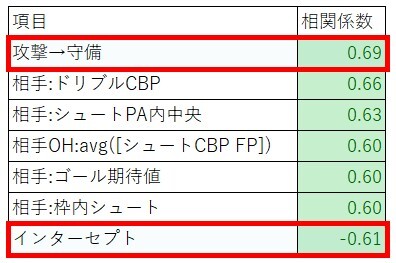 正(プラス)の相関では「攻撃→守備」、負(マイナス)の相関ではインターセプトです。