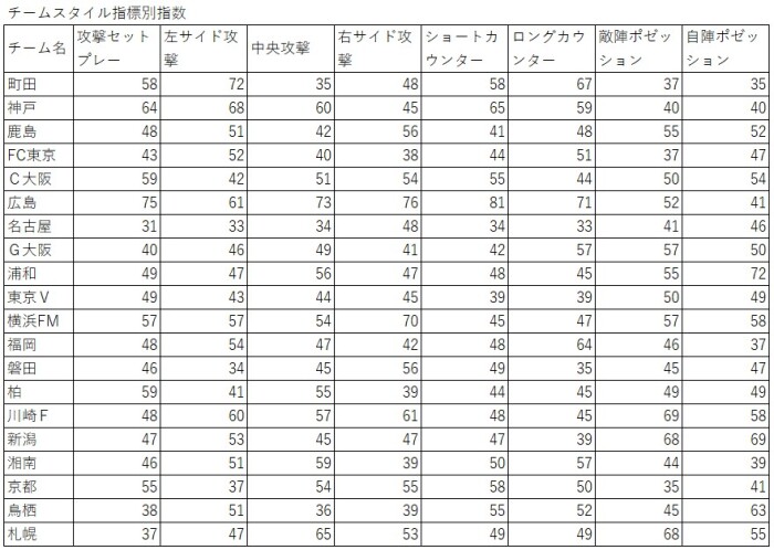 まずFootball LABさんからチームスタイル指標別指数を拝借しました。