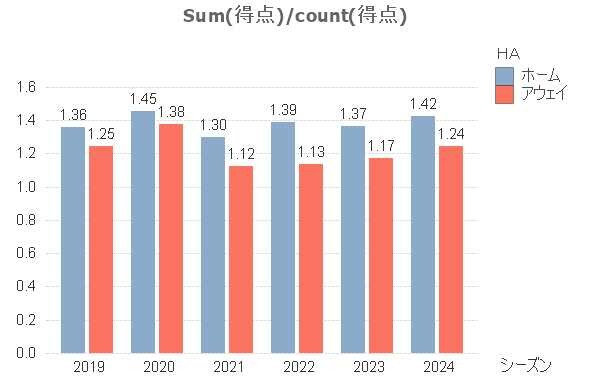 アウェイよりもホームの方が得点が多いですね。