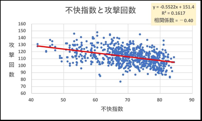 不快指数と攻撃回数には弱い負の相関があります。不快指数が高くなると攻撃回数が減るという関係です。