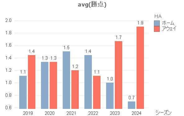 2019~2024シーズンの第1節だけのホームチームとアウェイチームの平均勝点を可視化した。