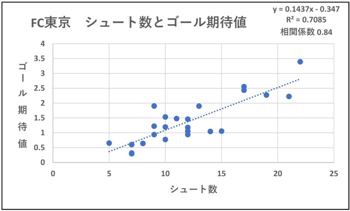 シュート数が多いとゴール期待値が高くなります。