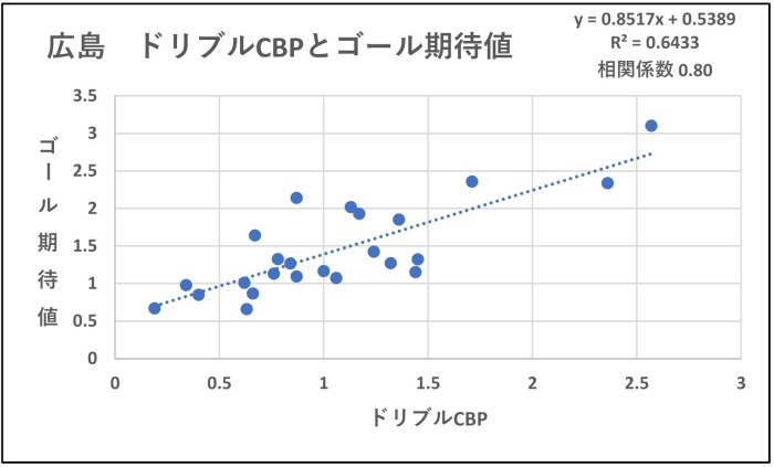 ドリブルCBPが高いとゴール期待値が高くなります。