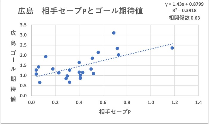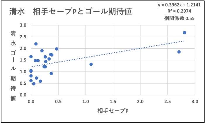 清水も同様で相手セーブPとの相関が強いです。ただし、広島と比較すると、清水は一部データの影響で相手セーブPとの相関が強いようです。