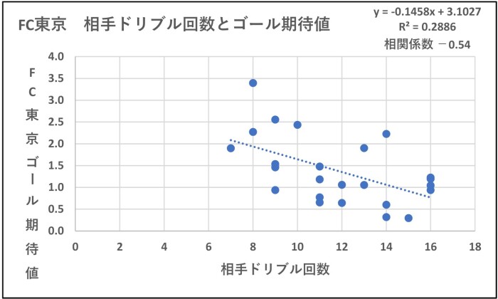 FC東京は相手ドリブル回数と相関が強いです。負の関係です。