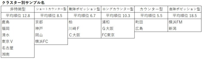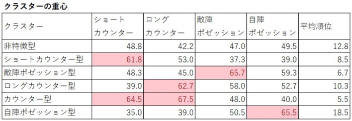 これを見ると納得の平均順位ですね。いずれのクラスターだとしても、そのクラスターの戦術や戦略の精度を上げないと上位には食い込めないようですね。