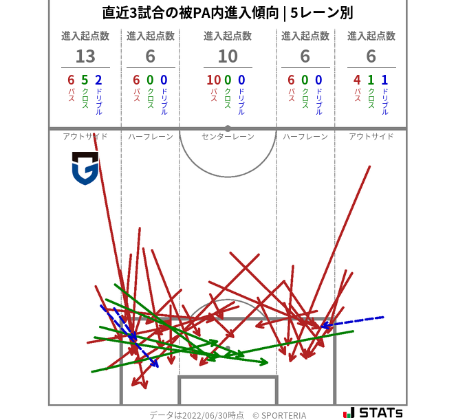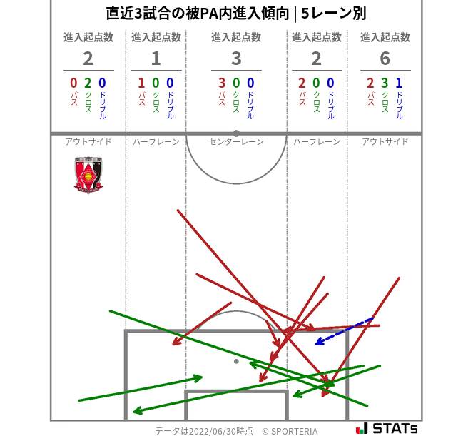 浦和の被PA内進入傾向が少ないつまり前半ボールを握っていたのにゴール前まで攻めれていない