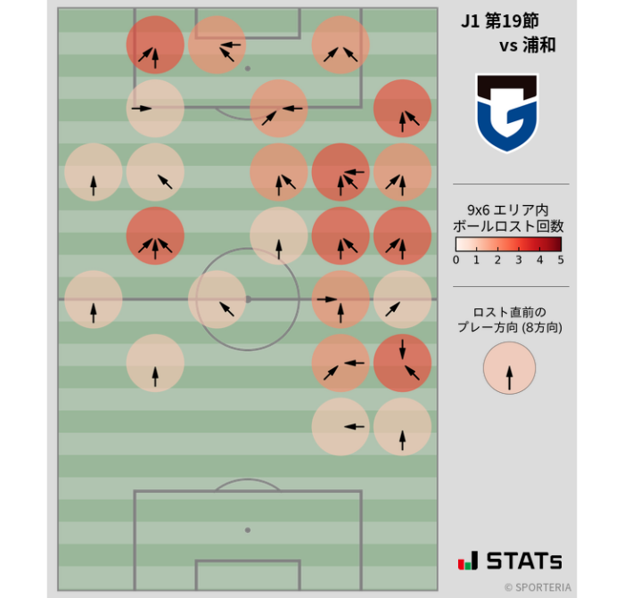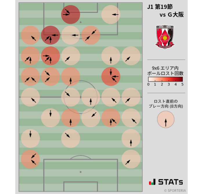 浦和のボールロストの位置と直前のプレー方向を見ると後半は浦和に押し込まれた時間があったので前でのボールロストが多いがガンバに比べ後ろでボールロストしてるのが多いことからガンバの攻守の切り替えが早くガンバがボールロストしてもすぐ切り替えてまたボールを奪うことで押し込む時間帯が増えた