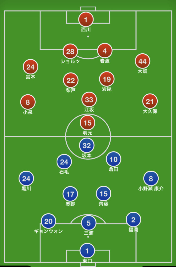 浦和はいつもどうりの4-2-3-1守備時は江坂と明元が並んで4-4-2になっていた