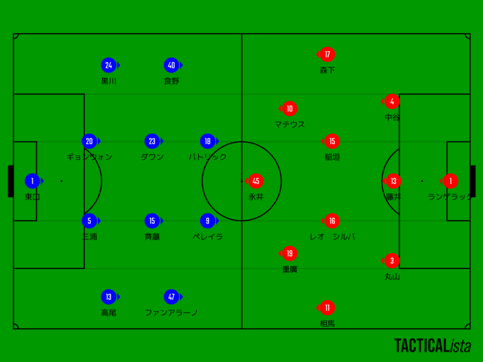 フォーメーションは前節と変わらず4-4-2で守備時はコンパクトに攻撃時は奪ったあとに速いカウンターをして得点を狙っていた