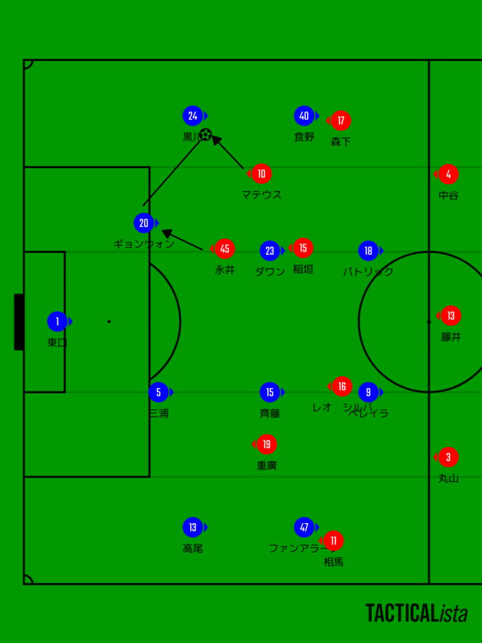 名古屋はサイドバックにボールが入るとスイッチを入れてプレスに行く(前節のブログで言った同サイド圧縮)そのためパスコースがなくなるがそれでも繋ごうとしていた