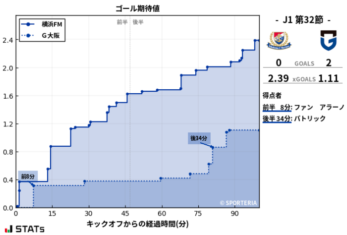 ガンバは1.11と押し込まれている時間が多かったにも関わらず1を超える結果になっている特に2点目を取ったあとはチャンスも多く理仁のヘディングは入ってもおかしくなかった