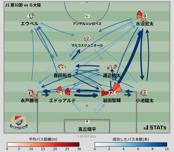 その策にマリノスはハマりサイドのパスが多いのがわかる