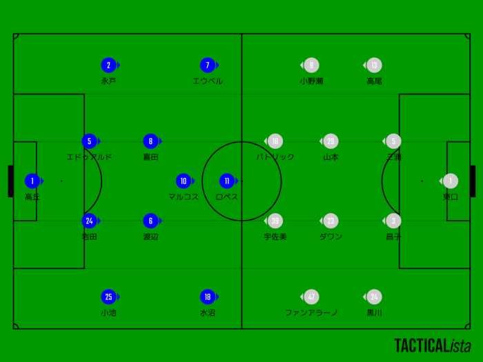 試合前の狙いではおそらくもう少し前で奪ってショートカウンターなどを考えていたのかもしれないがマリノス相手ではそれができなかったが後ろで3ラインをコンパクトに保つことで失点もゼロに抑えられたのでは