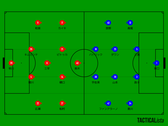 前節からレアペ、小野瀬からパトリック、食野に代えてきた