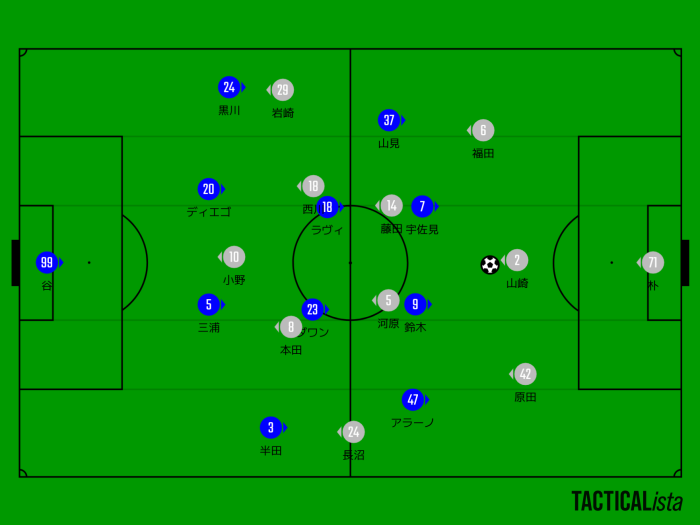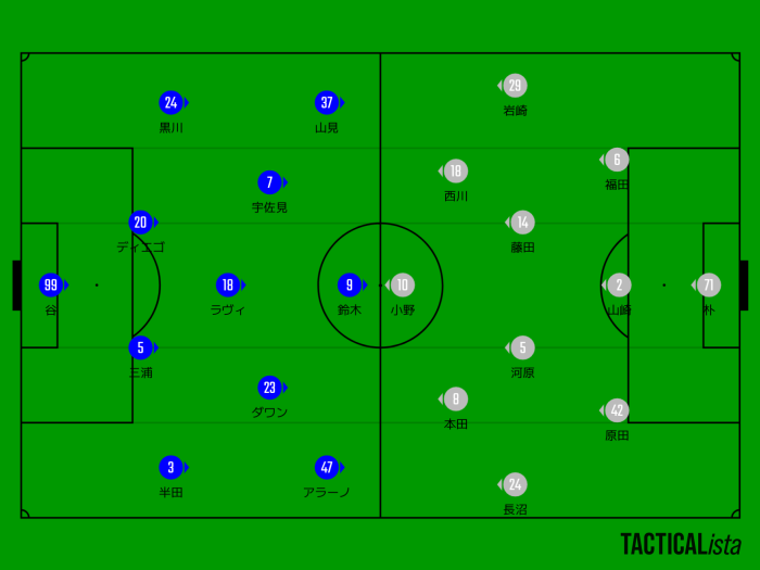 前節から山本(悠)、杉山、食野からラヴィ、アラーノ、山見に代えてきた