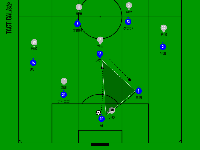 ラヴィの立ち位置がこの図のように中央にいると谷にプレスが来ても簡単にはがせる(これを3人目の動きという)