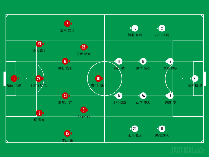 したがって中盤の並びはフラットな4枚に。#6輪笠 祐士と#41田部井 涼を並べる2ボランチに、幅を取る両WBは左へ#2高木 友也、そして右へ#15本山 遥がセットされた。